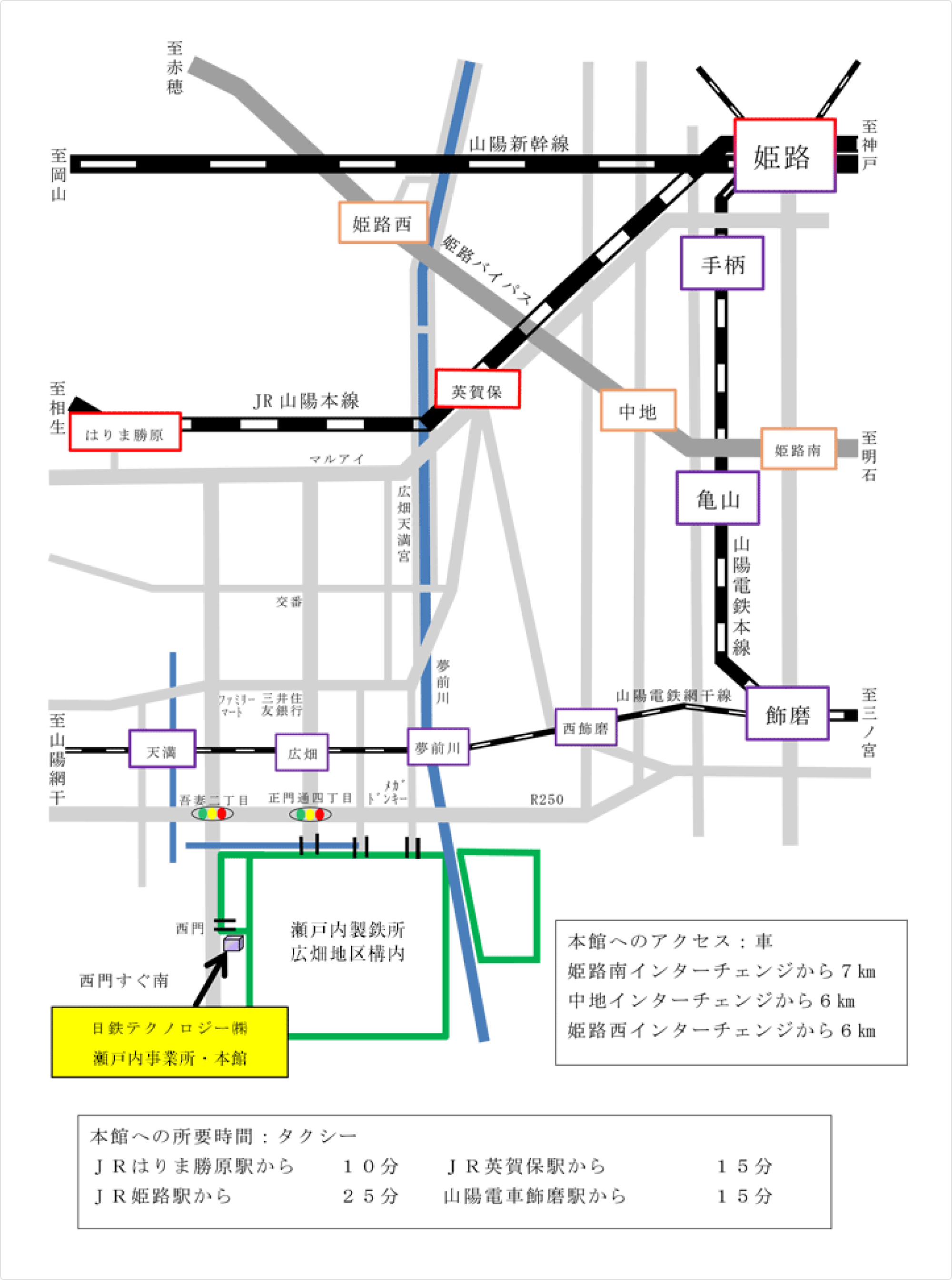 山陽電鉄:広畑駅からは、案内図を見て瀬戸内製鉄所 広畑地区の正門(もしくは西門)よりおいで下さい。(広畑駅より徒歩約15分)