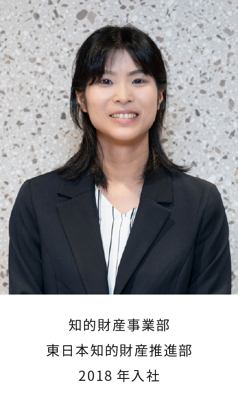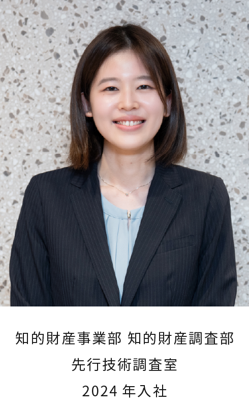 - 入社後は先行技術調査室に在籍しています。私が報告書を提出した後に、権利化担当の方が発明者、特許事務所の方と話し合われるのですが、自分が提出した報告書に載せた文献が発明のブラッシュアップに役立てられていたときはやりがいを感じました。