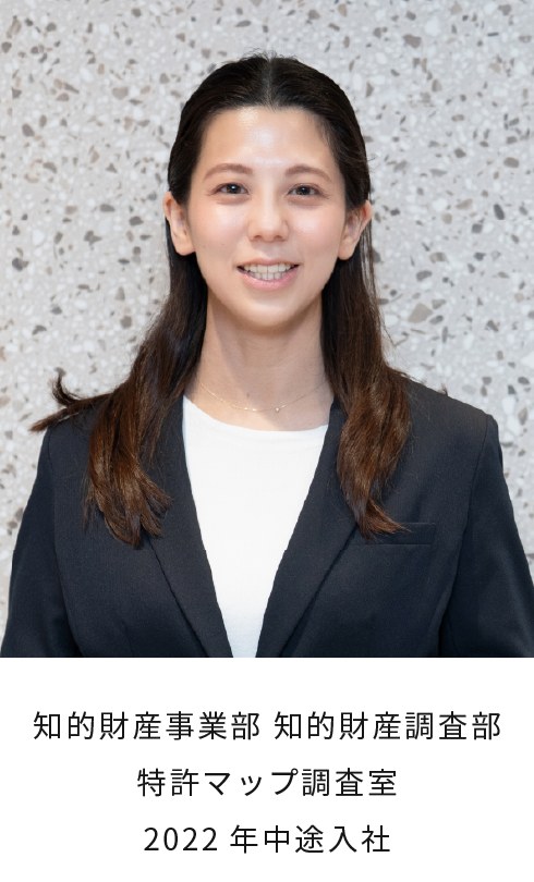 - 私も調査の結果が生かされていると知ったときはやりがいを感じました。調査の際に見つけた資料が役立ったり、作成した特許マップが親会社の研究方針を決定するときに使われたことがあったり、やりがいを感じます。