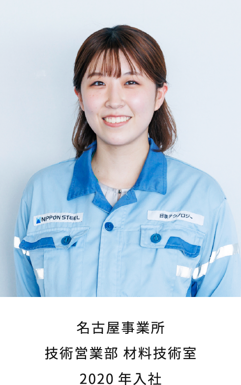 - 私も入社3年目まで技術・品質管理部 試験技術室にて設備導入の業務に携わったあと、4年目から技術営業部 材料技術室に異動になり、高機能ナノインデンターという装置の試料調整検討・測定・解析を担当しています。いずれの業務でも共通しているのは、課題に対してどうアプローチするのかを検討し、試行錯誤しながら結果を出すということ。比較的自由な環境のなかで、自分で考えて主体的に取り組めるところに魅力を感じます。また、現場の方や製鉄所の研究員の方など、各分野に精通したプロフェッショナルが揃っているので、学ぶことがとても多いですね。技術を磨くにはとても良い環境だと思います。