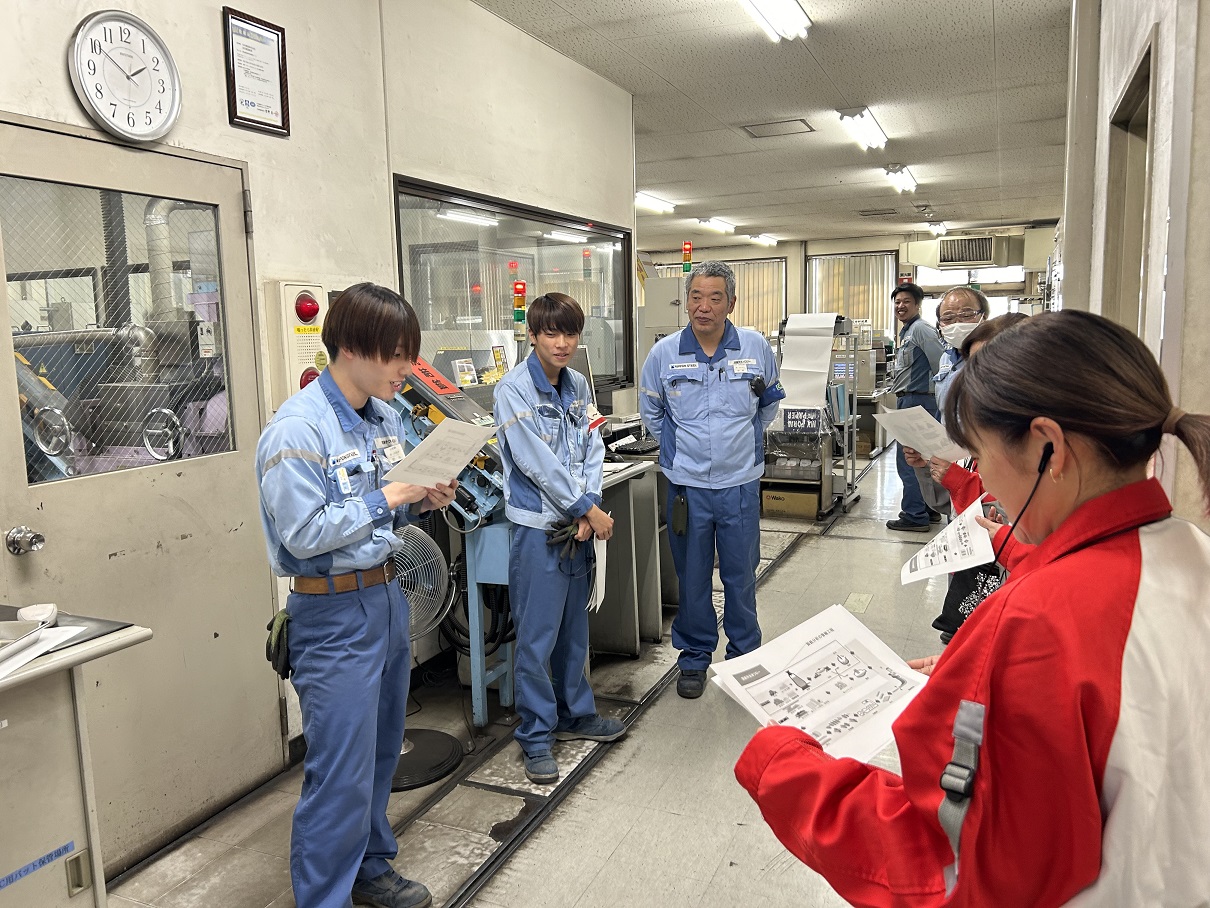 研究試験係長による現場での業務説明(左)・入社3年目までの社員による自身の業務説明⑤(右)
