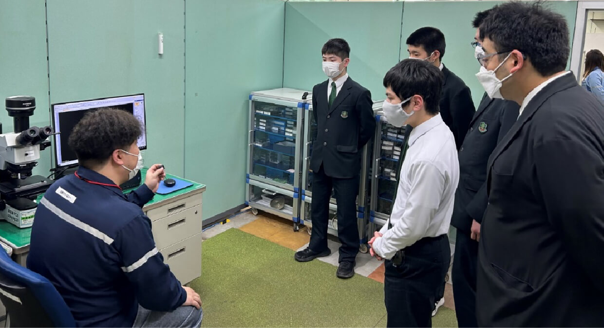 鉄の組織とは、人間に例えると性格のようなもので、組織を観察するということは鉄の性格を探ることと思ってもらえるとイメージしやすいと思います。外見は似ていても、組織を見ることで、この材料が硬いのか柔らかいのか等を判別することができます。組織を観察するためには、まず表面を鏡のようにきれいに磨く必要があり、その後、腐食(エッチング)という作業が必要で、専用の薬品をサンプルの表面に数秒浸すことで、表面から細かい模様、組織が見えるようになります。これを顕微鏡で見ると、はじめて組織を観察することができます。一連の作業の説明と、実際に顕微鏡で組織を見ていただきました。