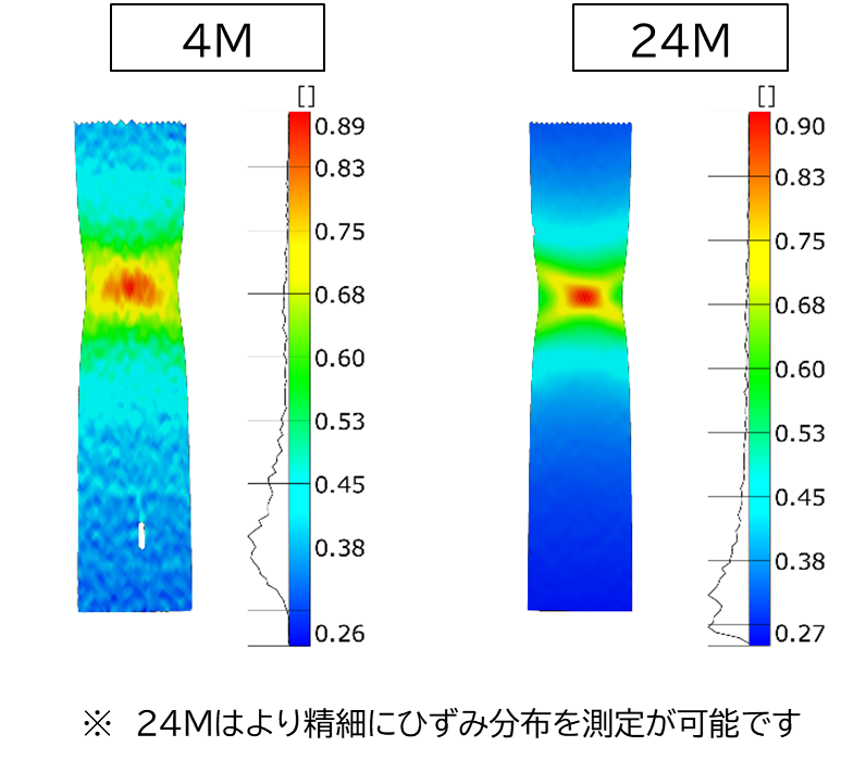 高解像度でひずみ測定が可能な解像度24Mピクセル仕様のほか、複数のカメラシステムにより幅広い解像度や測定範囲のニーズに対応することが可能です。これにより、微細な変形解析から広域測定まで、用途に応じた最適な計測が可能です。