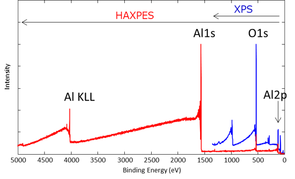 硬X線の励起によって、XPSに比して内殻電子まで励起できます。下記事例では、HAXPESでのみAl1sピークが検出され、化学状態解析、ピークの重畳回避等に活用されます。
