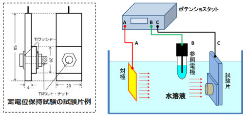 ステンレス鋼が塩化物環境で使用された場合、すきま構造部においてすきま腐食が発生する可能性があります。すきま腐食の発生は、鋼種、塩化物濃度、時間に依存しますが、その環境における鋼種選定の指標となるすきま腐食発生時間の測定ができます。このデータを用いて寿命予測が可能となります。