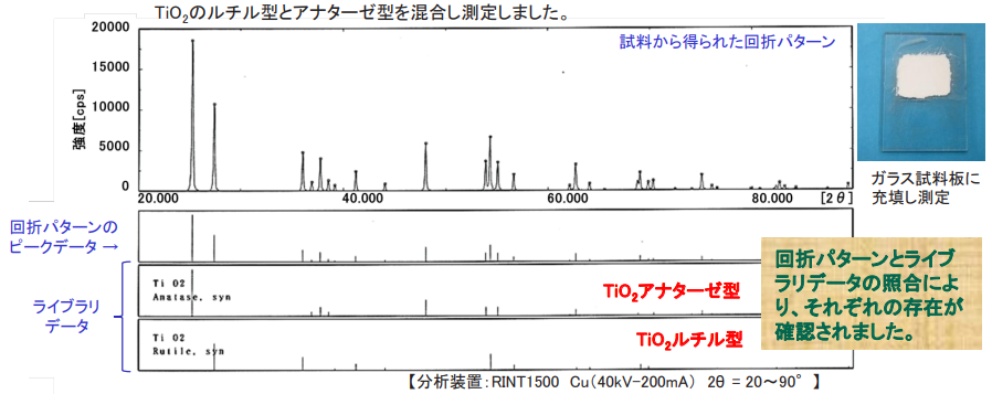 まず、未知成分試料の場合は元素情報が必要となります。(2 1参照)。XRD回折パターンは結晶構造を反映しているデータであり、元素が異なる物質でも結晶構造が似ていると回折パターンが類似し正確な同定ができません。従ってEDX等による元素分析と組み合わせて行います。