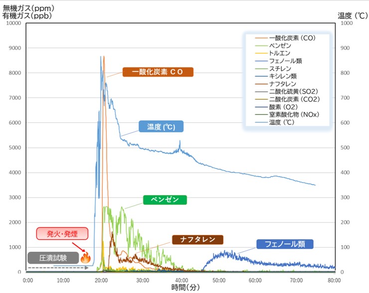 - 内部温度は900°C付近まで上昇。同時に一酸化炭素とベンゼン、トルエン等が発生。